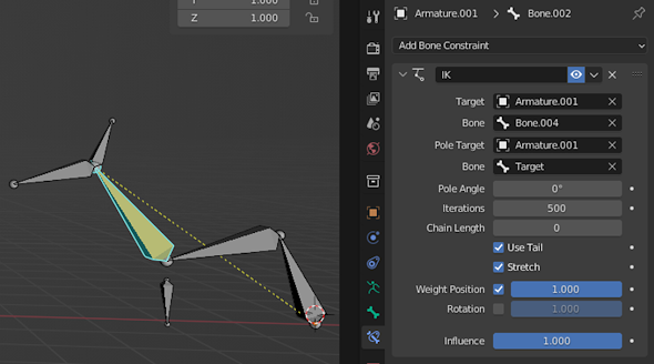 Uzun IK zincirlerini daha kontollü hareket ettirmek adına Target atamaları da yapabiliriz, yani kolu hareket ettirirken dirsek bölümünün kontrolden çıkmamasını istiyorsak dirsek hizasına Edit Mode'da dirseğin altına kendi başına bir Bone ekleyip (Clear Parents yapılmış olacak) ardından Bone Constraint Properties bölümünde IK ayarları altında Önce Pole Target'ı kullanacağımız Armature’ü seçip sonrasında alt sekmedeki bone kısmından target bone’umuzu tanımlıyoruz. (Önce pozu resetlemek için ALT+G—ALT+R yapmak gerekebilir eğer başka bir poseda kalmışsanız)